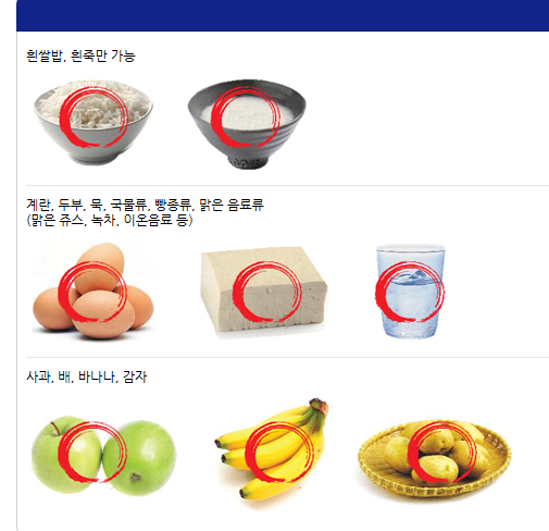 | 부드럽고 소화 잘 되는 음식 | 위와 장에서 쉽게 소화되고 찌꺼기가 적은 음식 | 흰쌀밥, 흰죽, 미음, 두부, 계란, 삶은 감자, 카스테라, 맑은 국물 |